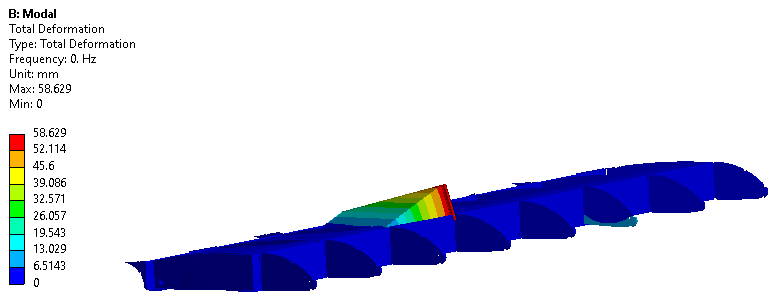 ArrayWell, now after doing everything I'm getting a new error: There is at least 1 small equation solver pivot term (e.g., at the UZ degree of freedom of node 861148). Please check for an insufficiently constrained modelThe model now looks like this at every body/part/solid:n I supressed the contacts in order to get a solid body, and used share topology in SpaceClaim (I also thoroughly checked for duplicate midsurfaces that would lead to intersecting volumes). Fixed supports can be found at the lines that define the holes where the wing is attached to the fuselage at the root of the wing, and vertical loads are set at each rib to simulate the spanwise lift distribution. Here's the file too:nPS: Body sizing is used in order to eliminate the quad meshing failed on __ errornArrayn