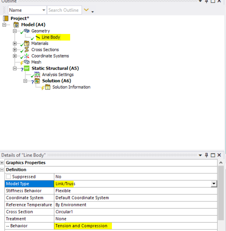 So mesh with only one element per structural member (so set you element size to 10 m or something very large to get one element per member), and the choose link/truss type (which is a truss element) under the line body definition and model type details/