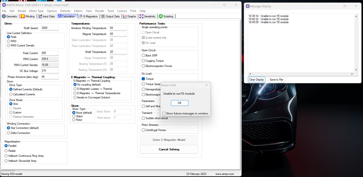 I have run into an issue when trying to use Ansys Motor CAD to obtain some results (torque) for an Electric Motor.I have input all parameters for my electric motor however when I click 'solve E-magnetic Model' under the Calculation tab, it gives me an error on the Message Display saying 'Unable to run FE module'. Below is an immage of the error. Can I get some assistance on this please?