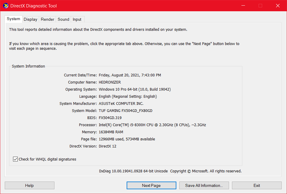 Forum ModeratorCan you open a Windows command prompt and run "dxdiag" and return the information from that tool?