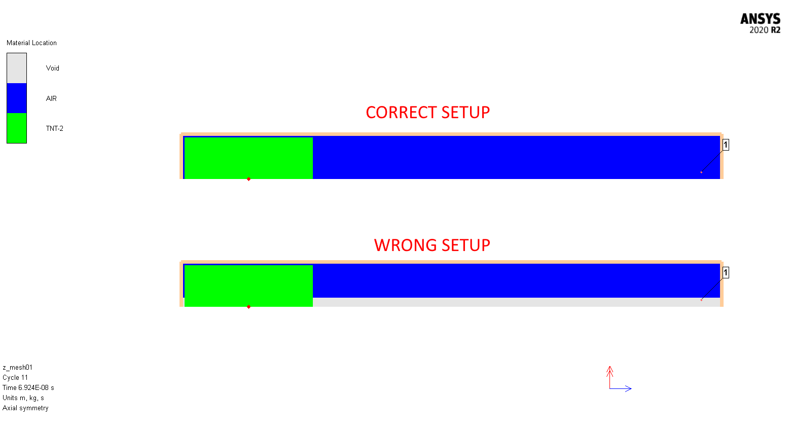 I'm doing a 2D simulation on AUTODYN in which a TNT explosion occurs, and I want to measure the pressure in a certain point by using a gauge. The problem is that as soon as I start the simulation AUTODYN replaces an area of air with void (see image) and this changes the results.