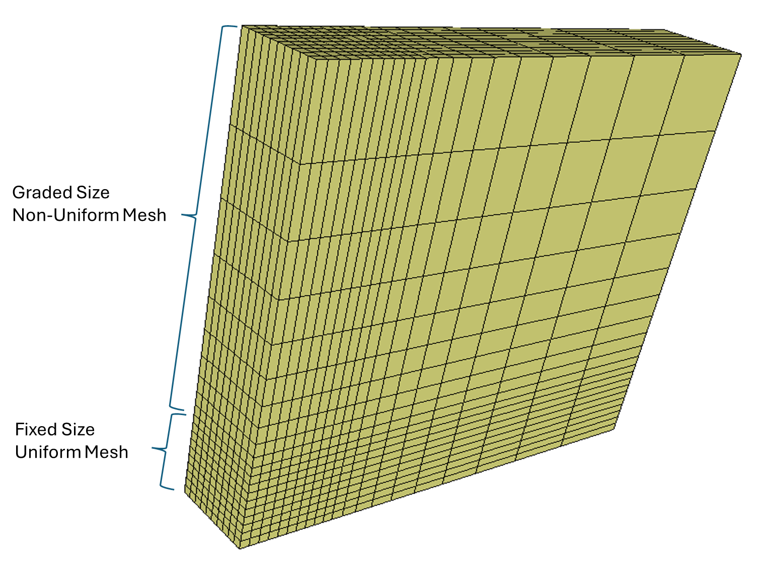 In Autodyn’s graded zoning, the fixed-size elements are always uniform in size. The graded zoning is applied to the surrounding regions, allowing for a smooth transition in element size away from the fixed zone.