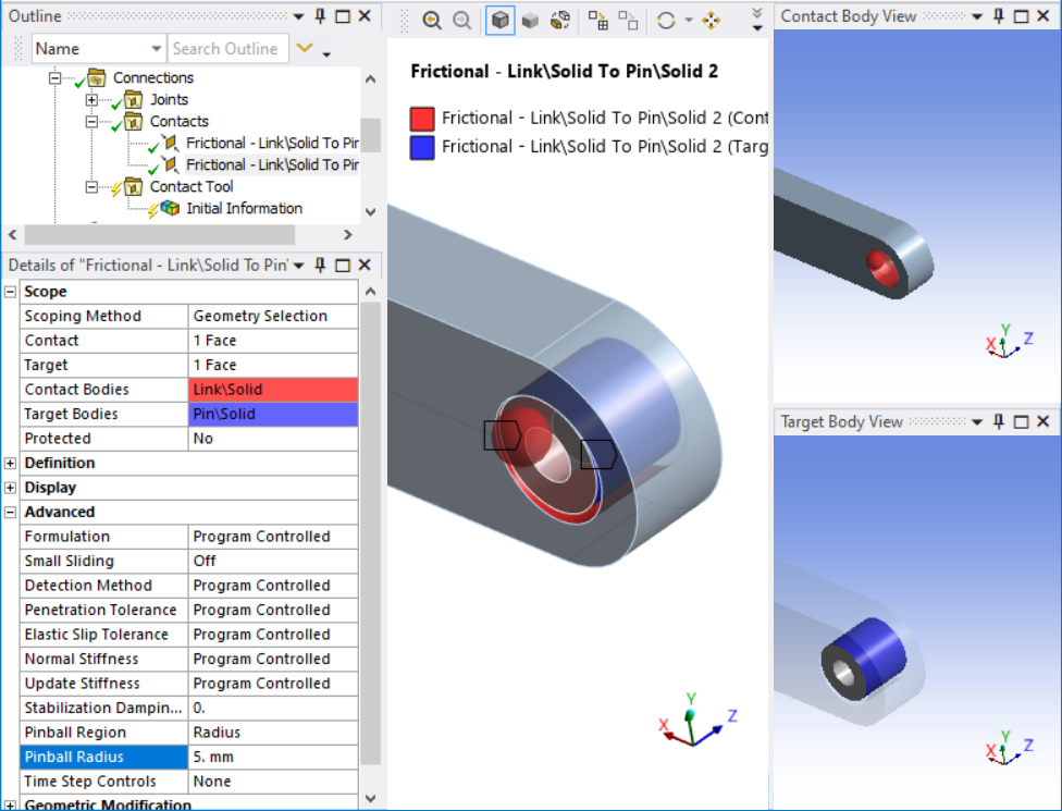 On each contact definition, set the Pinball Region to Radius and type in a number so that the transparent red ball passes through both surfaces you picked.