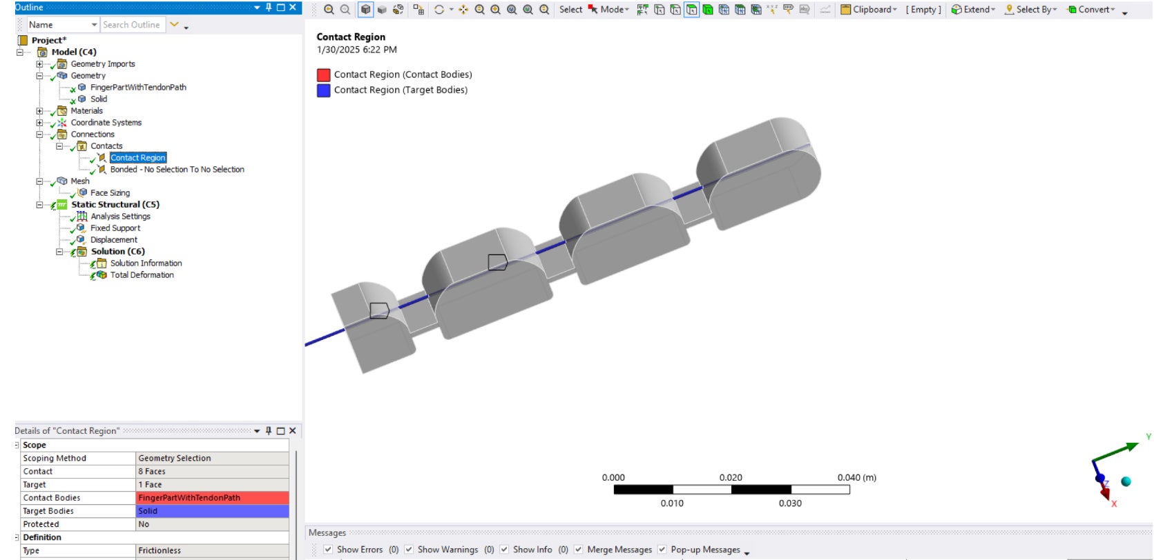 SubscriberThank you for the suggestion, I really appreciate it. I was actually trying to add the cable through the finger using another solid which I set the material to nylon and turned on large deformation but never got the solution to converge. I think there was an issue with how I set up the contacts as I only had a frictionless contact between the tendon path in the finger and the tendon. Is there a better way to go about this?