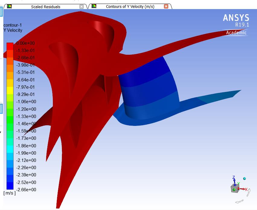 I am trying to create a model of one axial turbine stage, simulating stator (2 blades) and rotor (1 blade). I have two separate meshes for both and I am using a mixing plane between them with periodic rotating boundaries at the sides. I define rotor cell zone as rotating using Frame motion and 995 rad/s rotational velocity. I assign rotor blade and hub as Moving wall - Relative to Adjacent cell zone with 0 rad/s (so they move with the same velocity as the rotor cell zone) and rotor casing as Moving wall with Absolute motion of 0 rad/s of rotating speed (so it is stationary). Whole stator zone is defined as stationary.