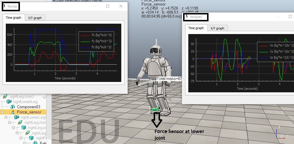 The force A and the moment B are the o/p of a dynamic simulation. The force and moment are obtained by placing a force sensor at the lower joint during the simulation as shown below.