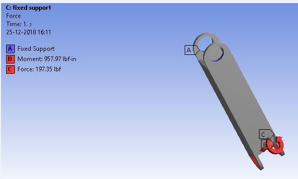 Now you want to know the stress in the part due to that force and torque. This is where the real world detail needs to be considered. The motorized shaft that is coupled to end A has features that clamp it to those two holes and those features are not in the model.