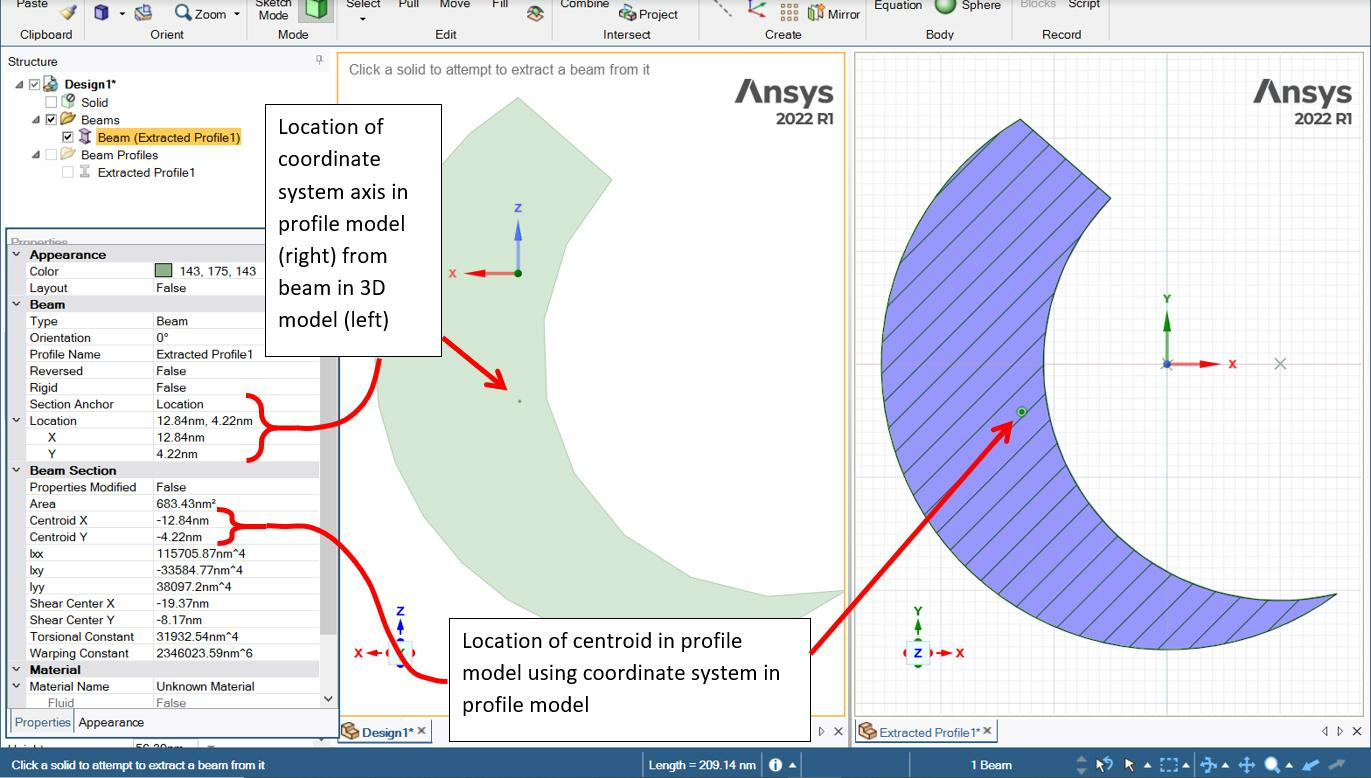 Ansys EmployeeYour code seems to be mssing a bit on how you create the cross section and assign to the beam.Beams cross sections in the 3D model are oriented (angle) and positioned (distance from centroid) based on the the position of the coordinate system relative to the centroid in the cross section model.It’s using a coordinate system along the beam in the 3D model, so the direction, or rather, starting point of this cross section sweep in the curve in the 3D model matters.To reorient beam cross sections, you can use the “Prepare > Orient” in the “Beams” section of the ribbon, or use the Move tool to move the cross section solid in the cross section model, or specify a centroid position and orientation angle in the beam properties.
