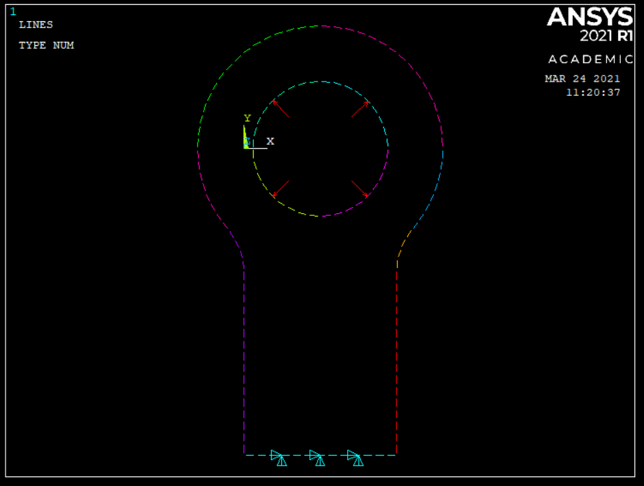 One way to distribute the force around the half circle is to have a cosine fall-off. That means that for the node at top-center, the factor is 1.0 while for the nodes on either side of center, the factor reduces to 0.0 at 90 degrees from top-center where the factor is the cosine of the angle from top-center. Since the assignment is to study "Pressure on lines" loading, pressure is always normal to the surface. So the Y component of all the normal forces around the half circle must add up to 740 N.