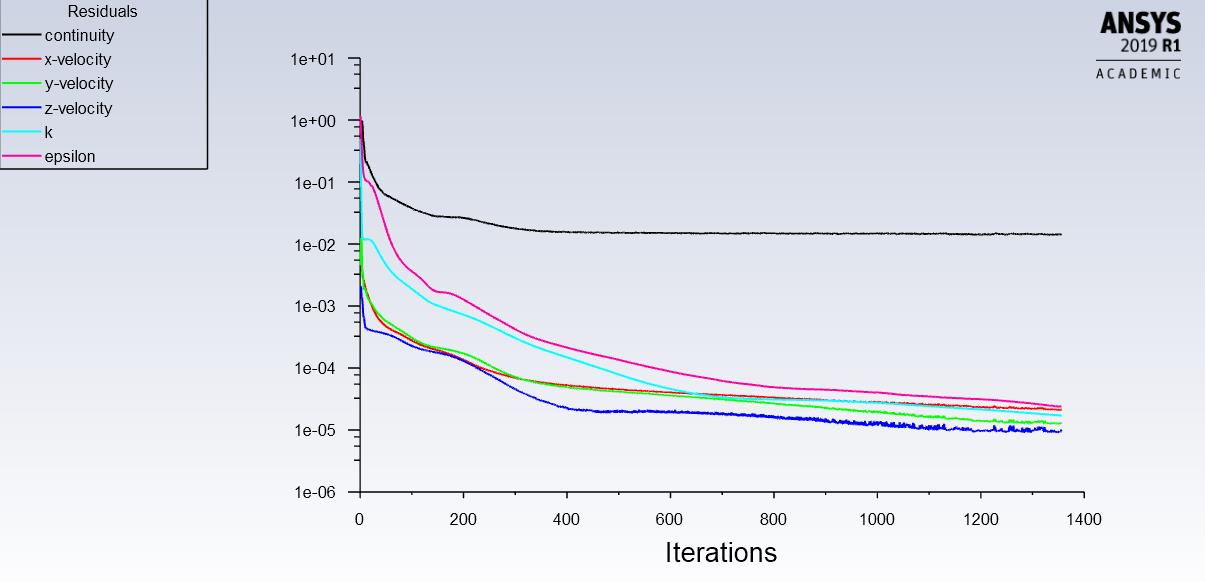 I then ran a k-e Realizable model with enhanced wall treatment and kept most parameters stayed by default. I implemented a second order upwind for the spatial discretization. After approximately 1000 iterations the residuals are constant. The velocities, turbulent energy dissipation etc.. seem to have logical values.