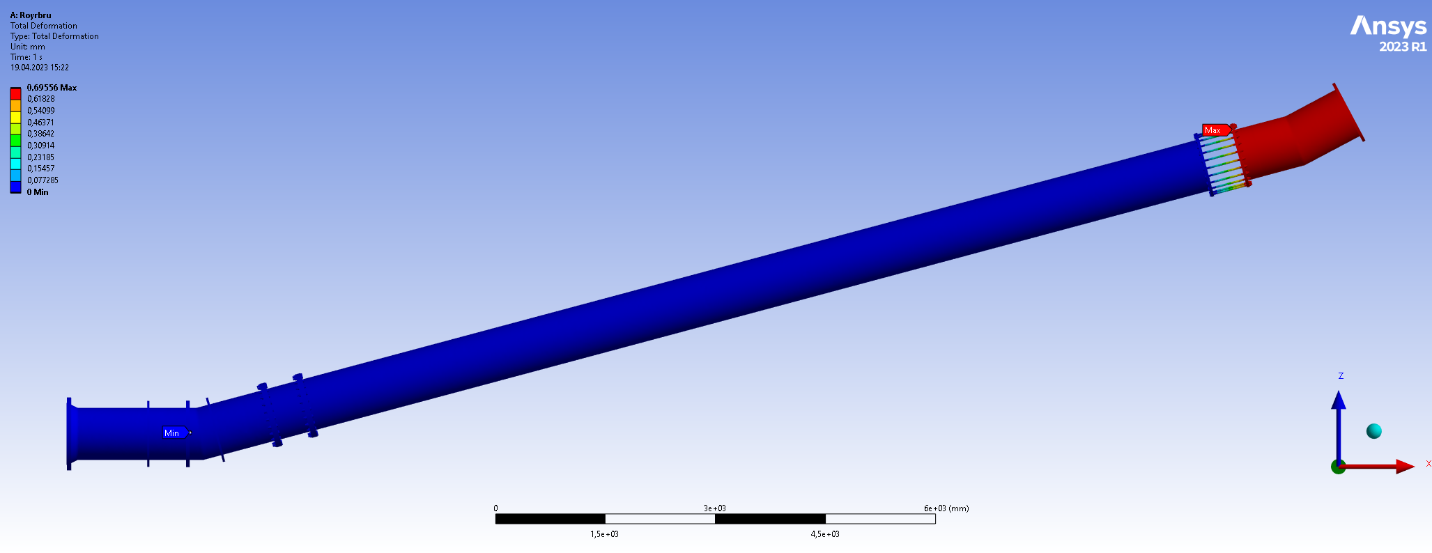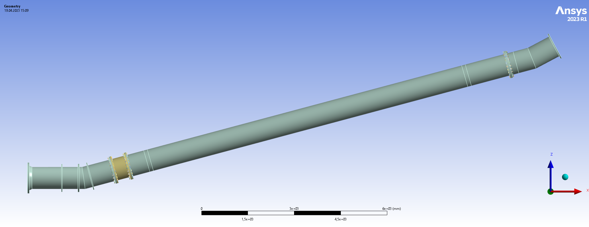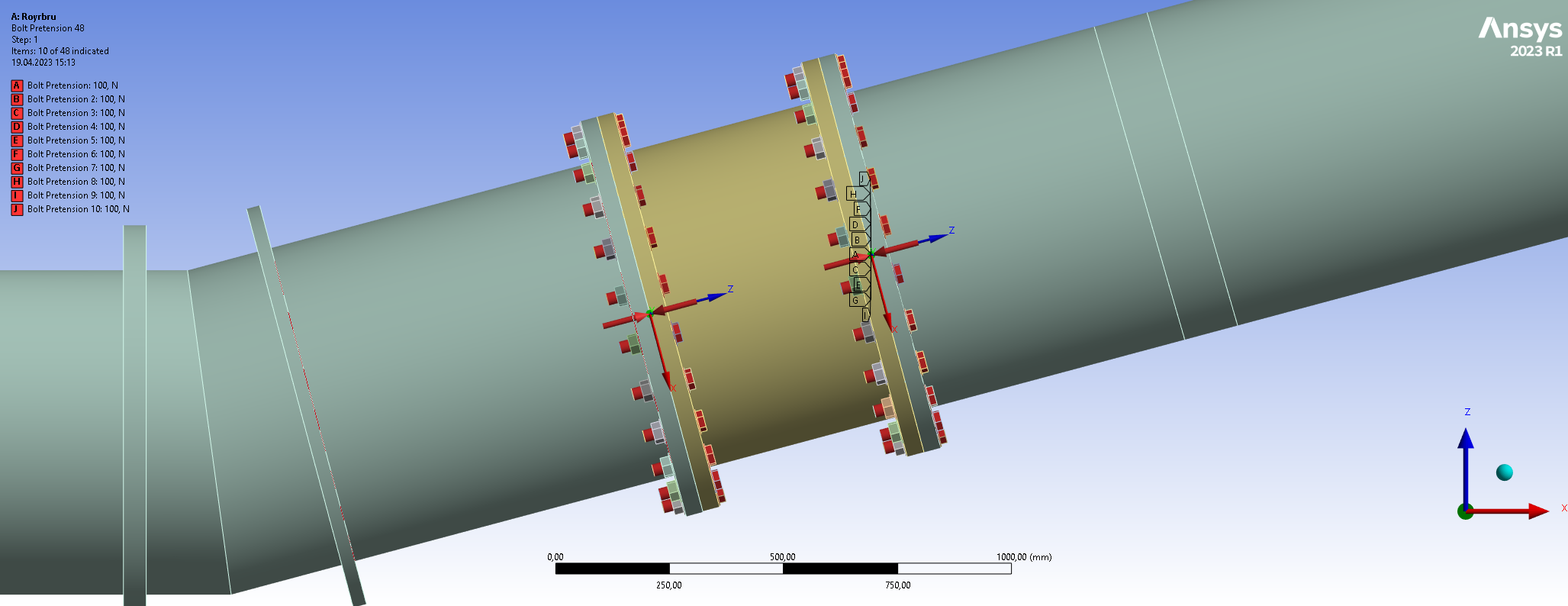 I have defined two load steps for which the first one is used to pretension the bolts (only by a force of 100 N). The pretensioning is then locked in the second load step. I have used local coordinate systems for pretensioning each of the bolted connections such that the pretension cutting plane is in the middle between each pair of flanges. This ensures that the pretensioning is not applied where bonded contact is defined. An example showing two of the pretensioned flanged connections: