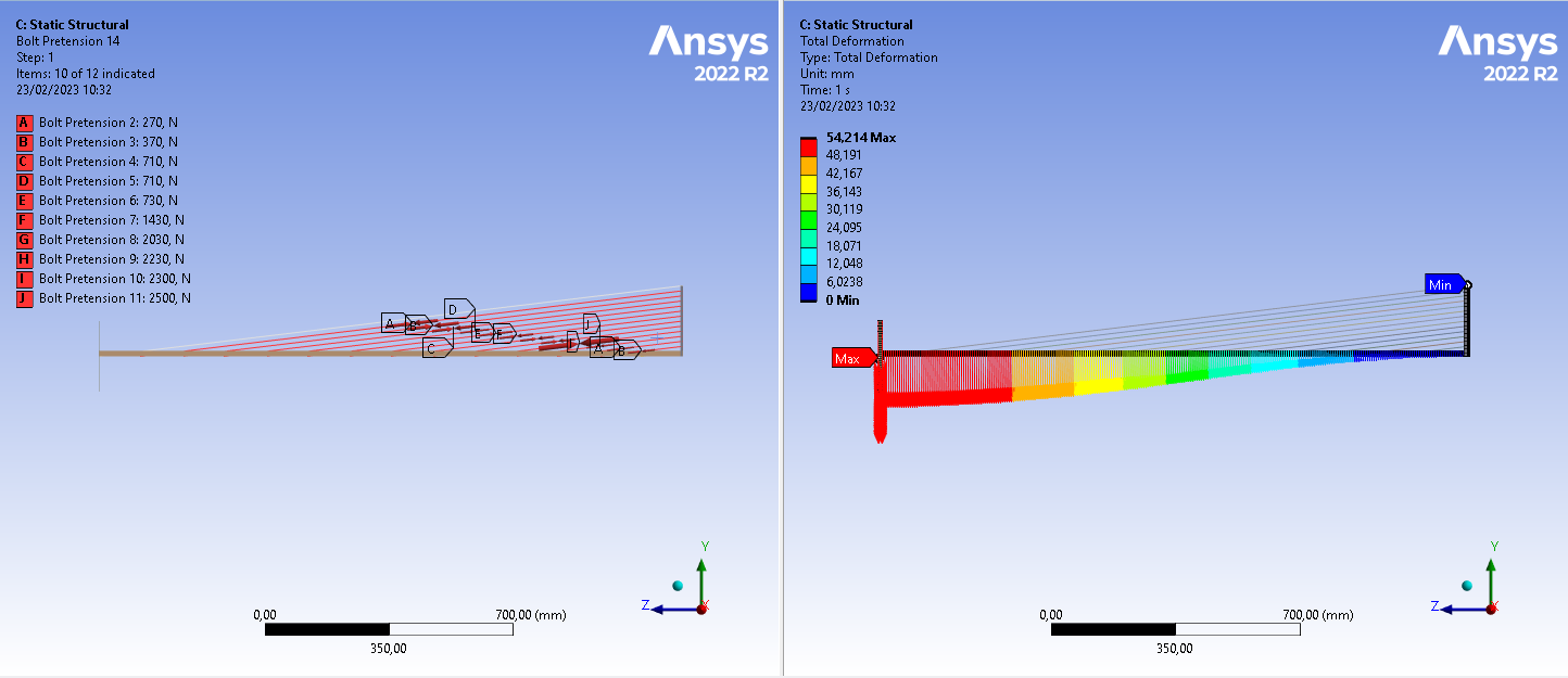 I have modelled the beam as solid element in the ACP pre and the thickness is in the Y direction. However i need to apply prestress to the steel cables that support the composite beam. I defined the bolt pretension and then instead of decreasing the vertical displacement, the vertical displacement completely increased and reached from 26 mm to 56mm. In steel structure, the same case, the deflection could be zero by tuning the bolt pretension in the cables.