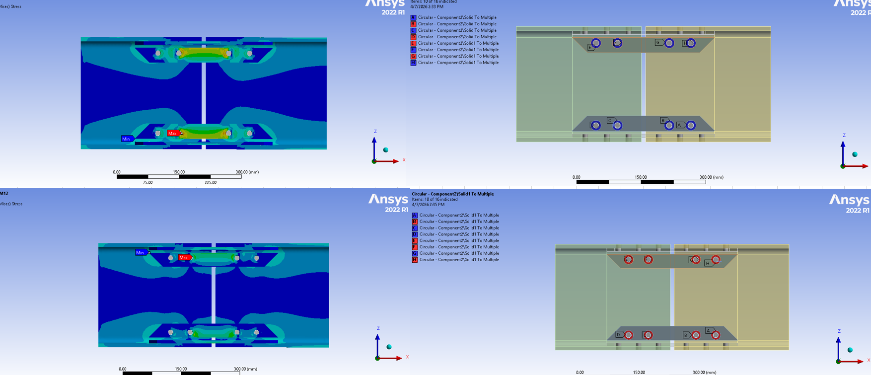 I'm facing an issue where the results change significantly depending on which scope of the beam is assigned as Reference and which is Mobile. As shown in the attached images, swapping the orientation causes the stress distribution to flip or become asymmetric (top vs. bottom image). This problem is also visible in the Directional Deformation, like shown bellow. I know its not geometry errors, since I made 1/8 of the connection and mirrowed with the 3 planes (X,Y,Z) to make sure it was symmetric.Â
