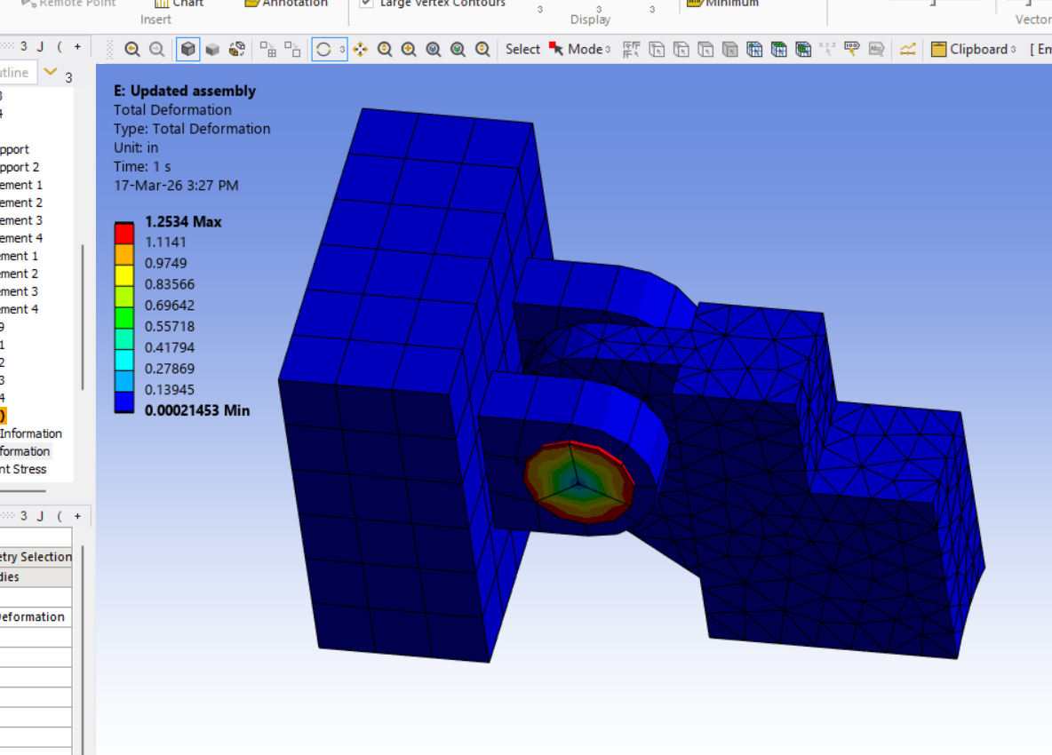SubscriberI'm having problems with a bonded connection in an Static Structural analysis. Looking at the Initial Info and Status in the Contact tool, it looks like the connection is set up and working, but in the Total Deformation result, I am seeing about 1.25" of deformation. It looks like rotation. The problematic connections are a pin bonded to two halves of a clevis. According to the Initial Information, the connections are closed, and according to the Status, they are Sticking (orange). However, the pin is moving 1.25" while the two havles of the clevis are not move. What am I doing wrong with this connection? The part on the right has a revolute joint with the clevis pin so it can rotate round the pin.
