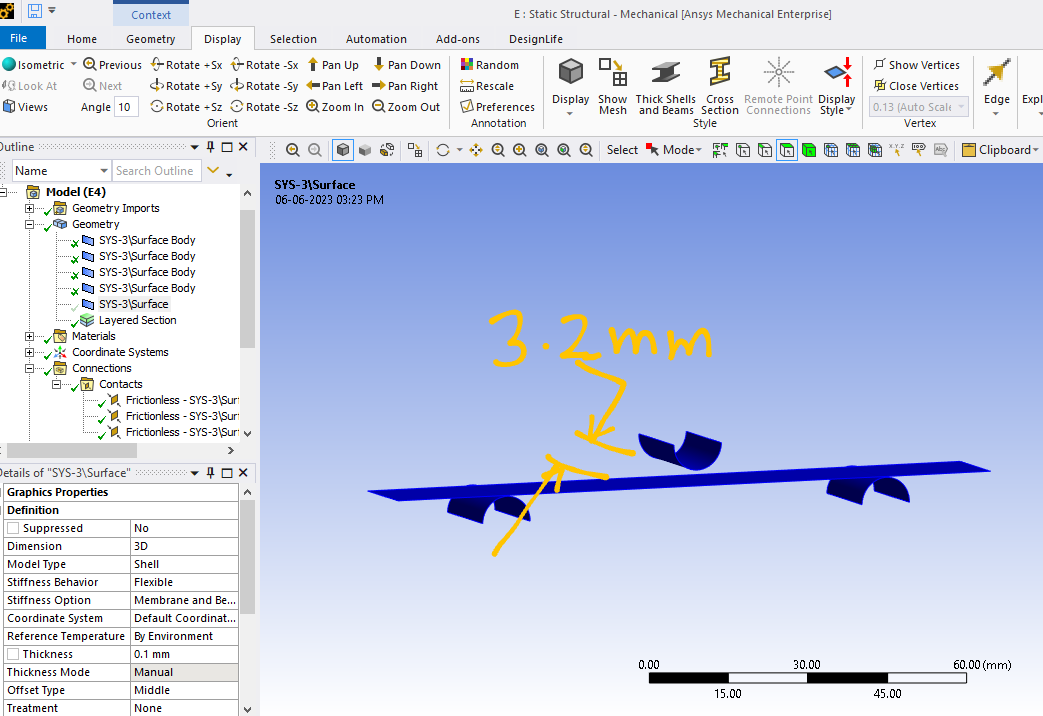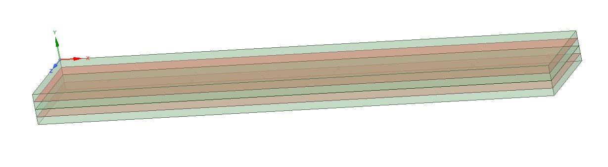 I am having trouble understanding the results I am getting for a particular problem. I have two identical plates which I want to bond together and subject to bending. To simplify the model, I created mid-surfaces from the solids, and created a 'Bonded Contact' between the resulting shells. The SpaceClaim model I used is shown below. The solid plates are shown in green and their mid-surfaces are shown in red. My understanding is that the two bonded plates should now behave as one plate with twice the thickness. I want ANSYS to take into account the thickness of the shells when creating the contact - the bond takes place in the plane which is mid-way between the two shells.