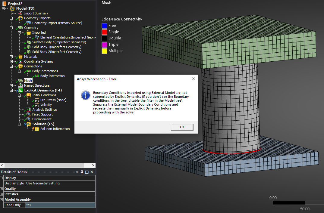 Now I want to use the same imperfect geometry in Explicit Dynamics (F) but the solver issues an error message.