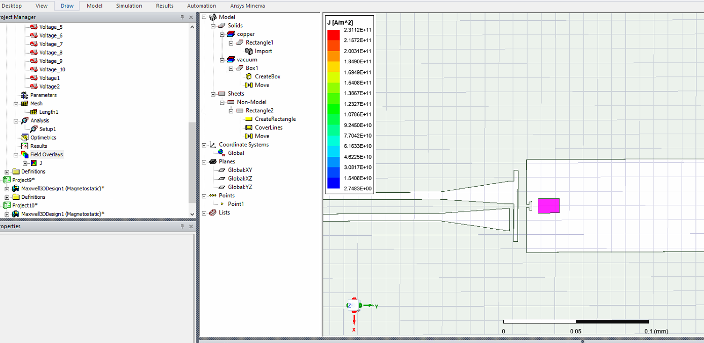 SubscriberHow can I calculate the flux through a non-model plane from the current density of a copper plate in Maxwell? I need to do it with the use of J [A/m^2] through the copper. Considering the use of fields calculator and applying Biot Savart's law, but how would I get the magnetic field from the current density in the 3d object to at least a specific point on the target plane(shown in purple). How would you also calculate the distance from every point(in the volume model?) Would appreciate any advice (Not using magnetostatic, as I'm trying a different method)