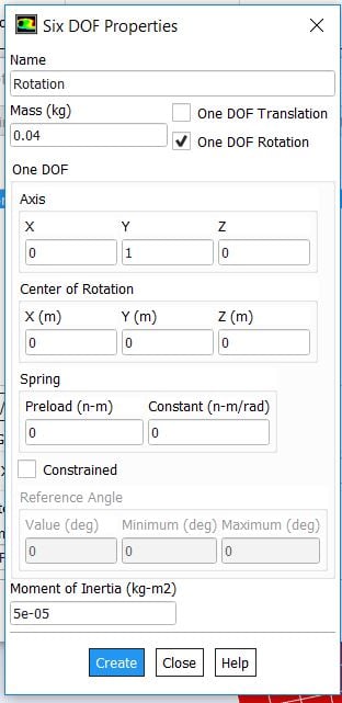 I have followed the tutorial indicated by Max4. I have just one issue and it disable the solving process. In "Dynamic mesh", "Six DOF properties", I entered a mass of 0.05kg and an inertia of 5e-5 (obtained via SolidWorks). The problem is that the program automatically set the value of the mass to 0 when I close the window. I have tried "5e-2" instead but the result remain the same...