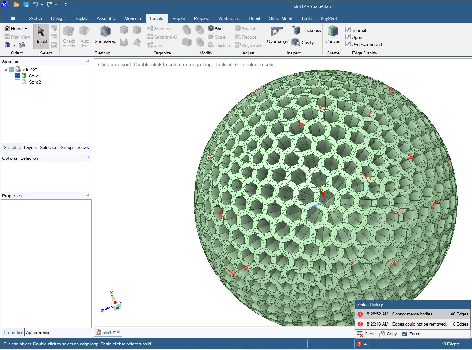 I have a geometry STL file and I converted it to solid geometry using SpaceClaim. I'm trying to combine two solid bodies. Errors come out, some are fixed, but there are no following problems.it is not possible to delete these edges either through delete or through "f", writes it is not possible to delete edges