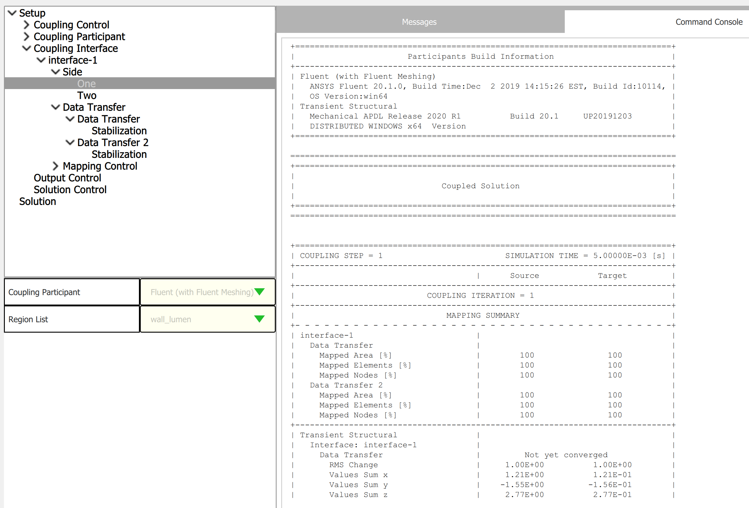 SubscriberHi Surya,nThanks for your suggestion! I tried changing the Coupling Participant names:nTransient structural was named 'Solution' and is now named 'MAPDL-2'nFluent was named 'Solution 1' and is now named 'FLUENT-1'nFurthermore, I changed the sequence of the sides, such that side 'one' corresponds to 'FLUENT-1' and side 'two' corresponds to 'MAPDL-2'n