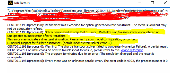 The message in yellow shows that "after 0 interation", meaning the solver may not start the interation. So pleae check your device configuration and make sure partition works fine before simulation. If there is a curved surface on a flate surface, you may consider to have a few nano meter overlap to avoid perfect geometry; you may also reduce the element quanlity, modify some tolerances, and use more number of iteration than the default one, if it is truely the divergence issue.