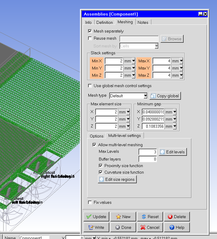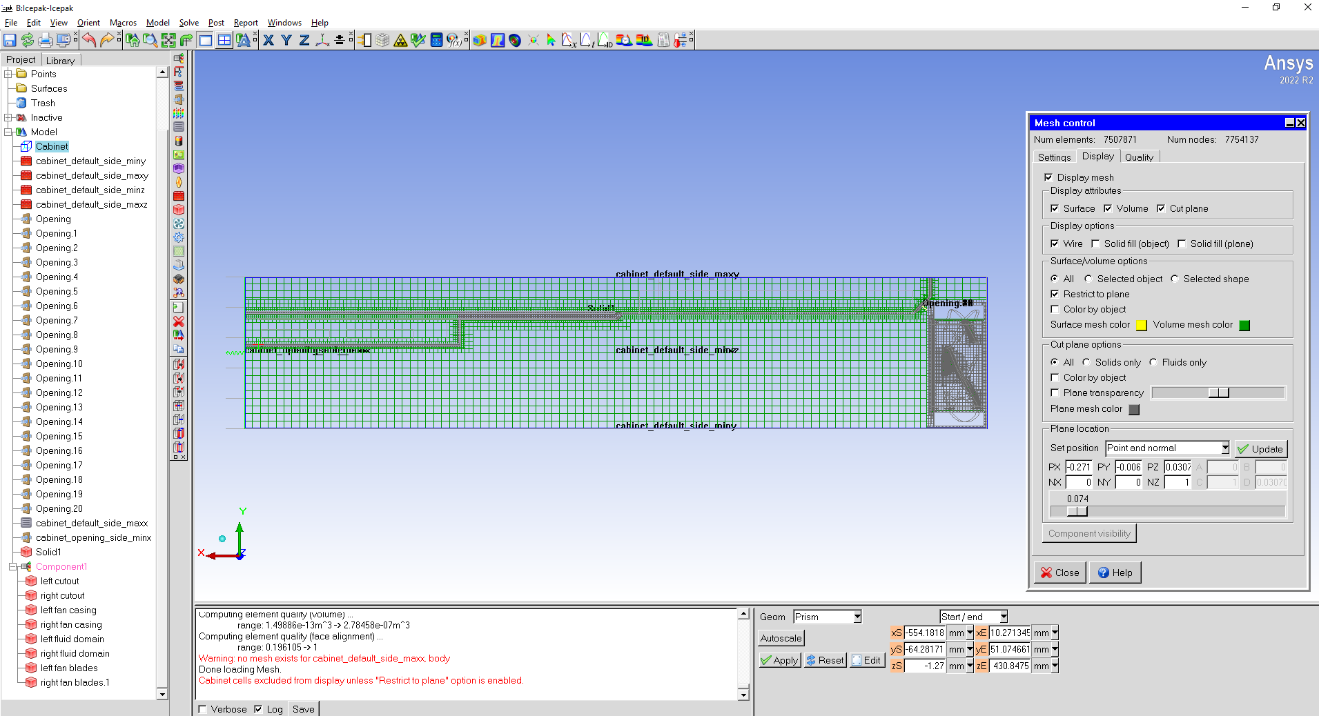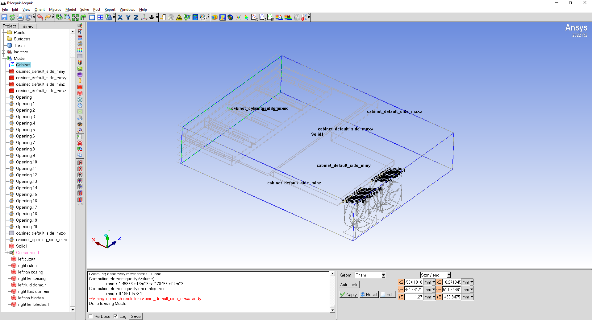 I'm trying to setup an airflow analysis inside of classic Icepak with 2x intake fans blowing in air onto a sheet metal chassis. I have followed the SCDM workflow wherein I converted model to Icepak compatible CAD objects. Chassis & fans are different assemblies, did this to define better mesh parameters on fans & for non-conformal meshing. The chassis has perforated incline openings near fans & sections at the end. The way it supposed to work is the air (ambient) gets pushed by fans over to the chassis through these inclined openings and come out the other opposide face (maxX). I have modelled the fan using MRF method with fluid block having RPM of 5000.