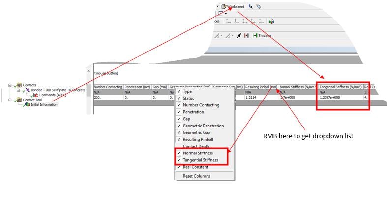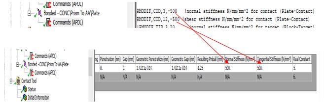 In both ways above you can then check your contact stiffness by inserting "initial Information" under the contact tool. you can right click on any text on the table head for ex. penetration and then a popup menu will show up all you have to do is to tick normal and tangential stiffness in order to add them to the status table.Â