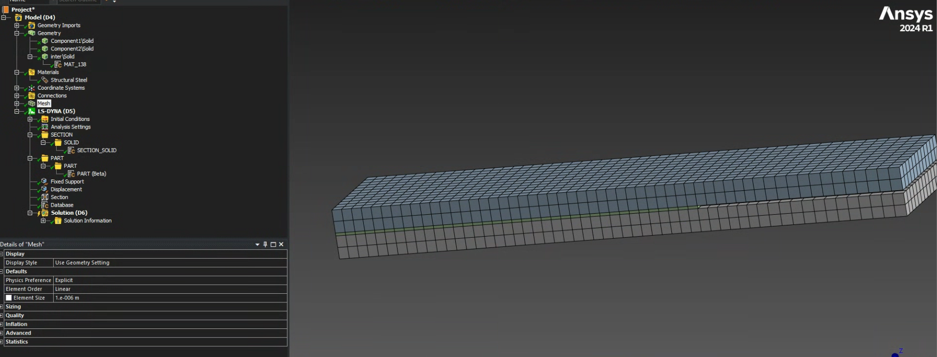 3. After meshing, I added PART (Beta) and SECTION_SOLID under LS-DYNA (D5) tree. PART geometry was the adhesive layer selected. I selected '8-noded, 4 point cohesive element' as 'Element formulation option' under SECTION_SOLID.