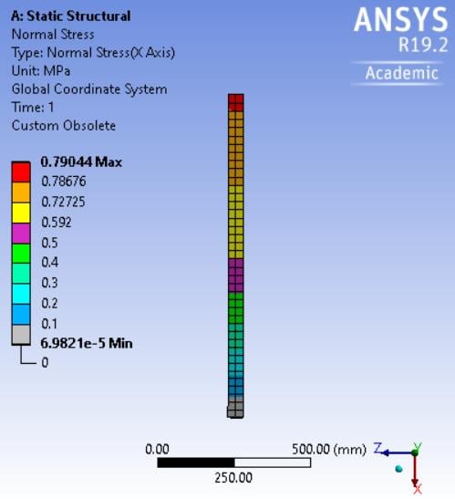I also exported the equivalent stress and I saw that the stress result is not proper as shown in the attached Figure. Because the stress can be calculated by using analytical formulation (sigma = 0.5*rho*omega^2*(L^2-r^2), where r is the distant from the rotation axis (z-axis) to the location that the sigma is calculated.