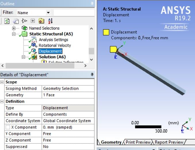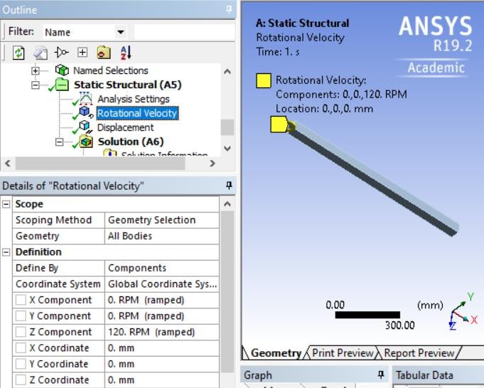 I mean that the rod is rotating about a fixed axis (z-axis) with a constant angular velocity of 720 deg/sec (not 720 deg/minute). I also neglected the affect of the gravity thus I did not assign the “standard earth gravity” in “static structural”. My purpose is calculating the stress and the elongation of the rod due to the centrifugal force. As I known, the elongation of the rod should be equal 1/(3*E)*rho*omega^2*L^3 (where, E is Young’s Modulus, rho is mass density, omega is angular velocity in rad/s, L is the length of the rod). However, my results from Ansys is not similar to the above analytical result. Is there any special step to simulate this problem in Ansys in order to get the correct result?
