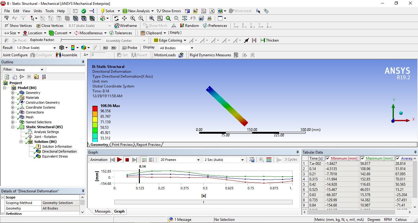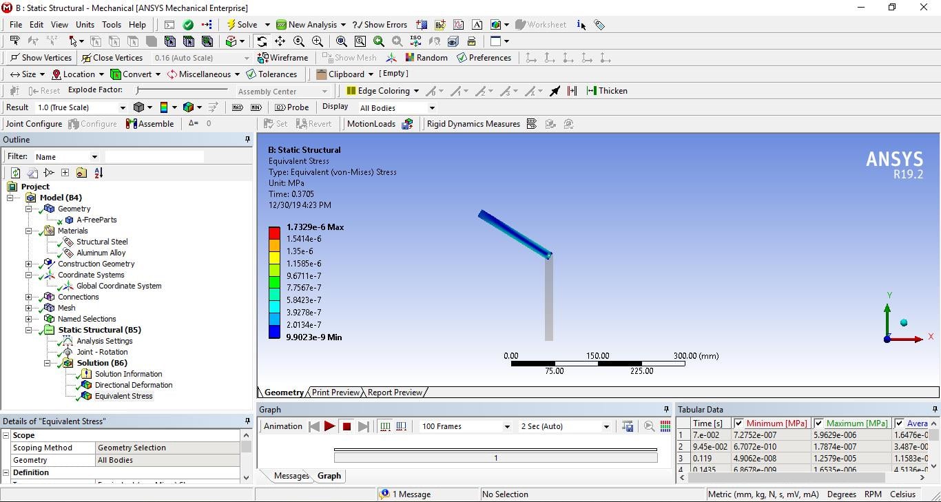 I am a student, I'd like to computing lengths and stresses for a rotating rod in Static Structural module. the boundary condition just only the degree of rotation is 360*time. Time equal 1 minute. As a results, I received the results like the picture: