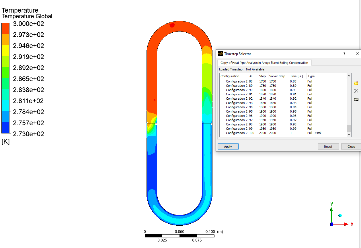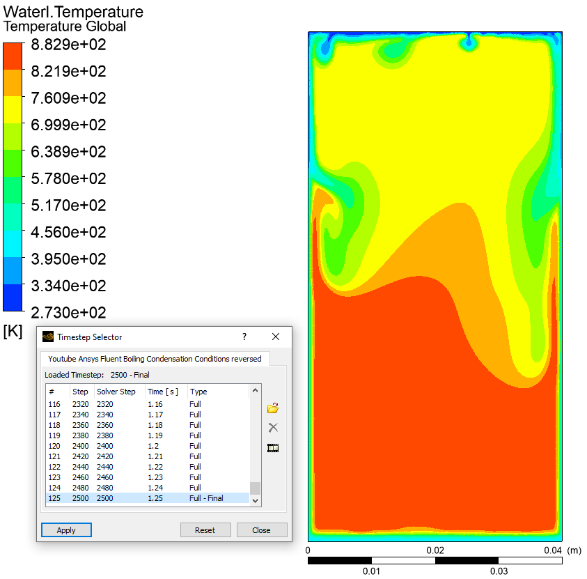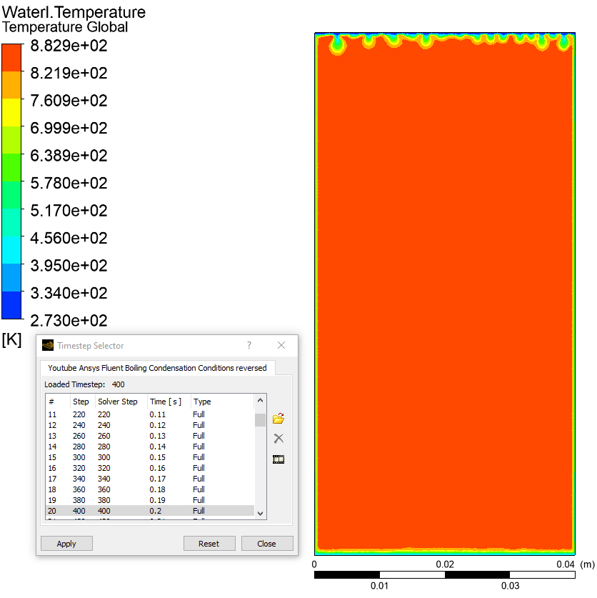 I have also changed the initialisation conditions from the linked tutorial so that the fluid domain is filled with water vapor rather than water liquid so that I can immediately and more easily observe condensation at the condenser surface. I have patched the temperature of the liquid and vapor phase to 300 K. However I obtain these large values of temperature in my transient run at time step = 0.0005 with 2500 iterations: