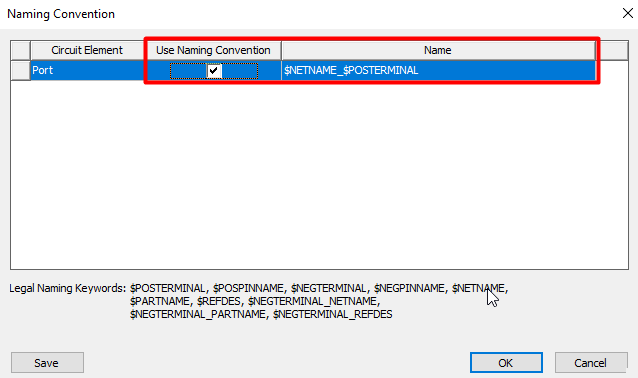 在Naming convention窗口可以编辑port的命名规则,如下图所示当勾选Use naming Convention时,则规则被定义为net名,下划线,加pin name。