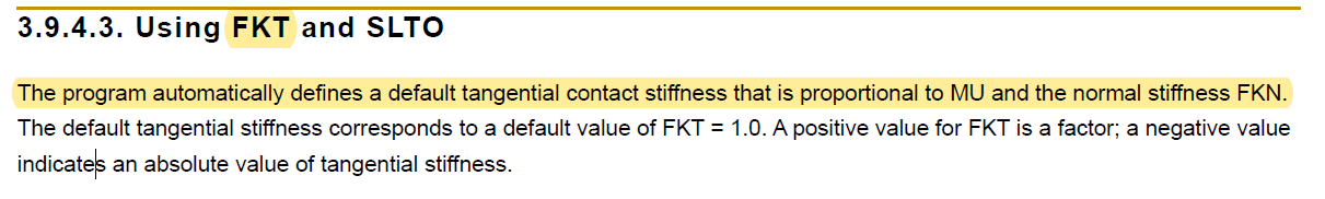 this equation KT for contact stiffness in the case of Lagrange but what I need the relation between FKT and (FKN, MU) in the case of Pure Penalty. In Ansys Manual "The program automatically defines a default tangential contact stiffness FKT that is proportional to MU and the normal stiffness FKN."
