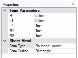 I am using Spaceclaim with ANSYS 19.1 and I am trying to design a heat exchanger with louvered fins. To do this I am creating an individual rectangular body and adding rounded louvers to it with the form tool for sheet metal, as shown in the photo. The louvers have parameters on them including H, D1, D2, R1, and R2.Â