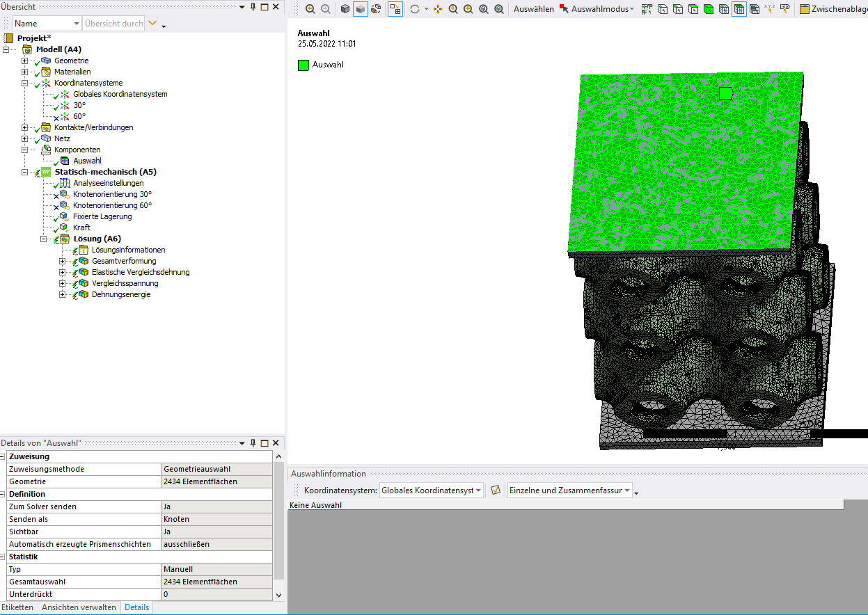 As mentioned, I want to add the same force at an angle (say 30┬░) on the top surface (like a tangential impact). With FE-Force (on nodes) and its connection to an additional, angled coordinate system, I am able to apply the force at an angle. If I use the "normal" force on the surfaces of the elements (see image), I can only apply perpendicular forces but cannot use a different coordinate system.