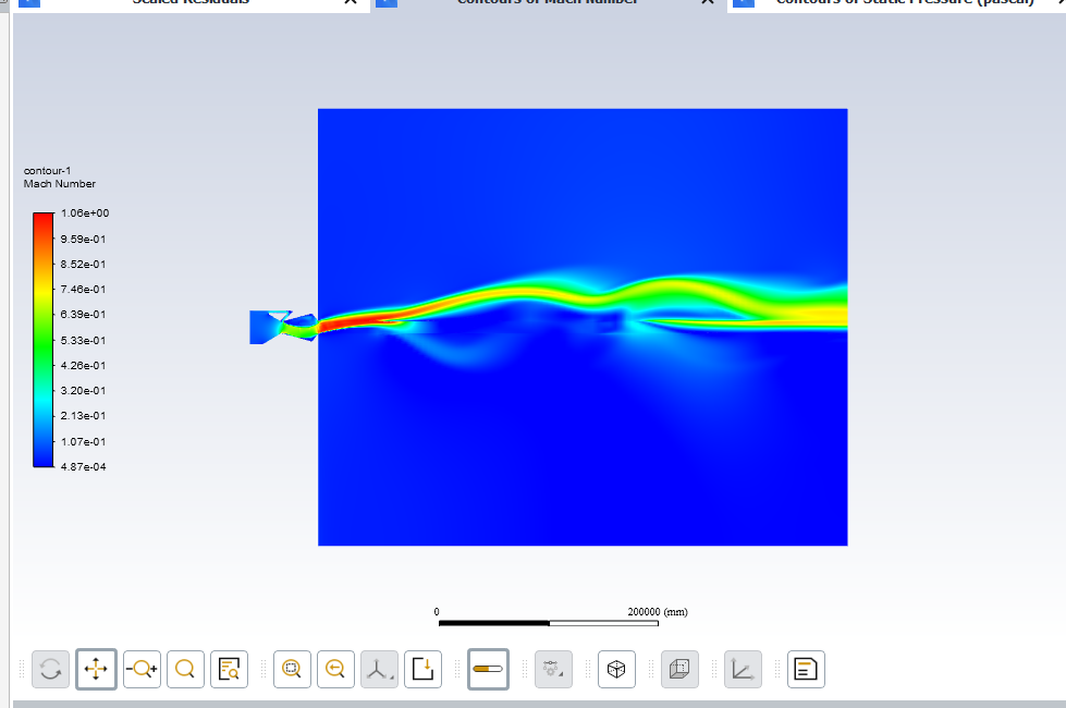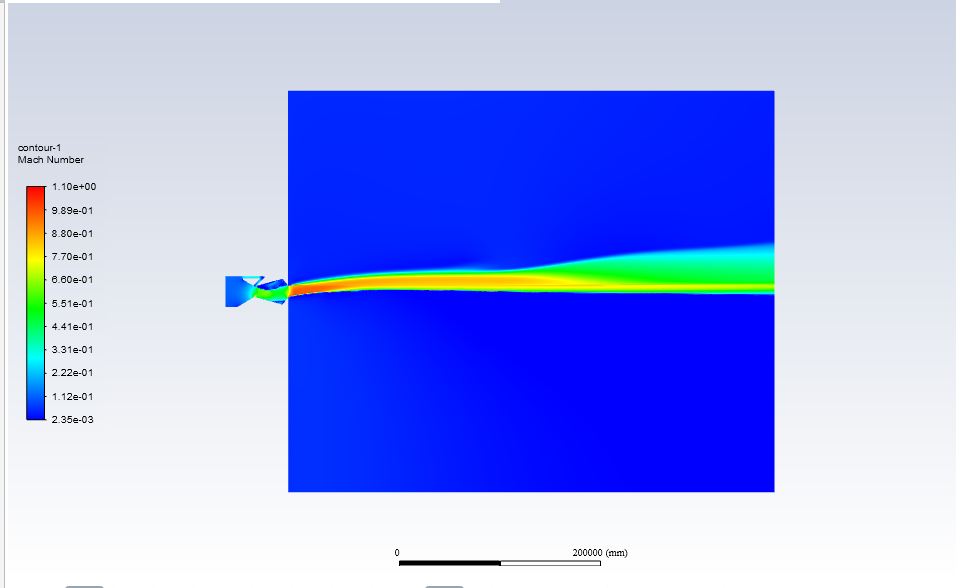 AdministratorHello,nBecause your flow is closer to M = 1, there is a good chance that your mesh might affect the overall simulation convergence. nOne thing I can think of - At the nozzle exit, your mesh begins to coarsen the y-direction. The y-direction jump in your mesh in the +ve y direction is too abrupt. Can you perhaps smooth this out?nKarthiknn -