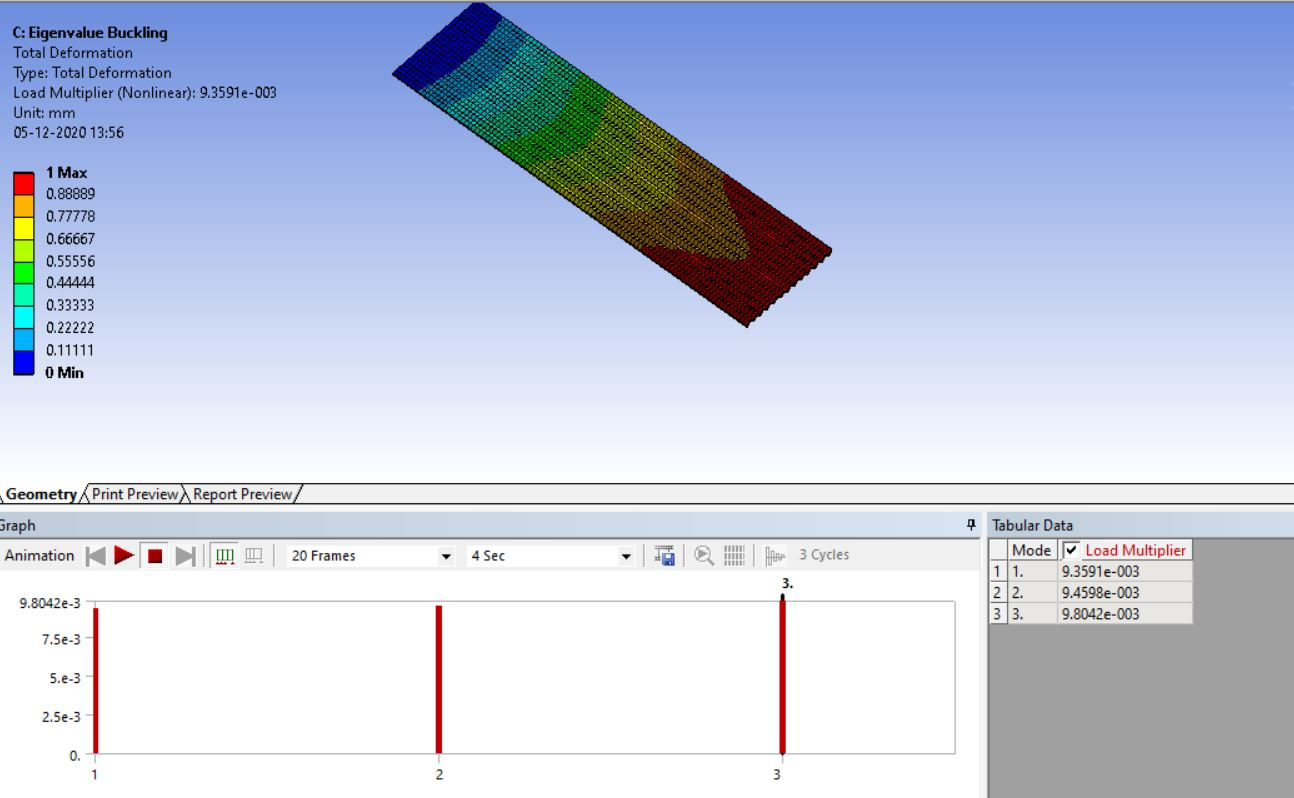 December 5, 2020 at 1:27 pm The sheet is 200 mm long x 50 mm wide x 1 mm thick.  I see that the solution fails to converge after stretching it about 2.4 mm along the length.  The reason is that the sheet will buckle, which means the structure will suddenly change its deformation from just being stretched to going sideways in some manner.nANSYS has an Eigenvalue Buckling Analysis.  If you setup the Static Analysis to pull just 1 mm, where it has no problem converging, then run the Eigenvalue Buckling analysis after that, it will calculate that the critical load factor is 2.8 or 2.8 mm since the applied load was 1 mm.nIt is possible, but very challenging, to simulate the post-buckling behavior of a structure.nWhat is the goal of this analysis?  Is 2 mm of stretch (1% strain) sufficient?  Why do you need to stretch it to 5 mm?  Is the post-buckled state important to see?nAttached is an ANSYS 19.0nn