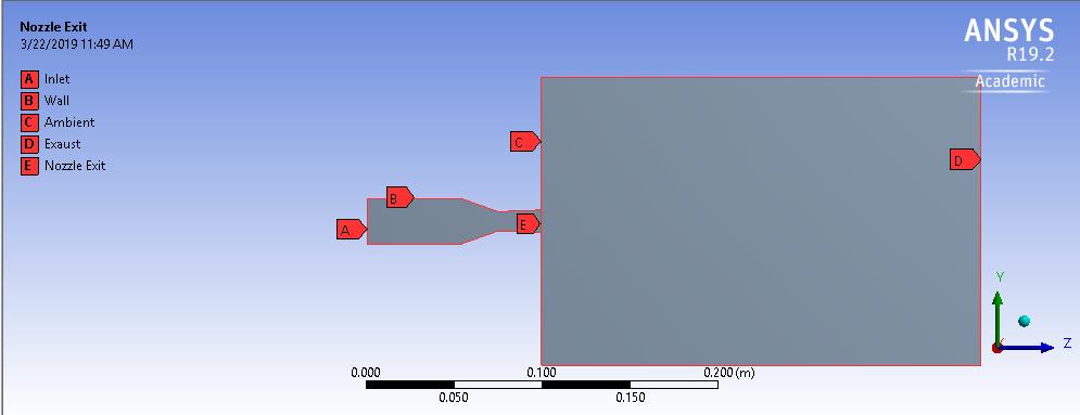Subscriber I reviewed it. The nozzle I have is rectangular not circular. It does not have an axis of symmetry. However, I am trying to build a model of the cross section to see if we get any results. My CAD model is for an experimental lab and it includes a section of the hardware in the lab before the CD nozzle. We do not know the exact input conditions at the entrance of the nozzle but we calculated the input condition at the entrance of the geometry directly before the nozzle entrance. It is included in the two dimensional CAD model cross section shown in the attachments.