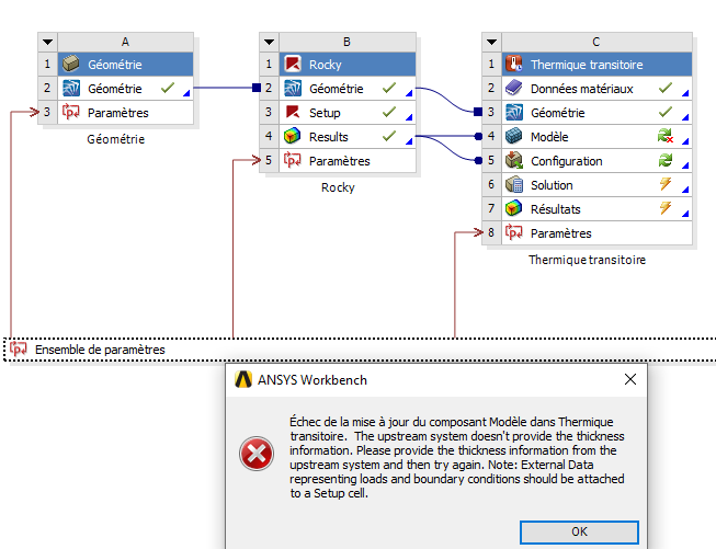 Subscriberhello, i am working on powder bed fusion process specifically selective laser meling, i simulate the metal powder particles on rocky dem and i will recover the results obtained from rocky to ansys transient thermal (so i can apply the laser on powder particles using the moving heat flux extension), an error is always displayed: Failed to update the Model component in Transient thermal. The upstream system doesn't provide the thickness information. Please provide the thickness information from the upstream system and then try again. Note: External Data representing loads and boundary conditions should be attached to a Setup cell nn