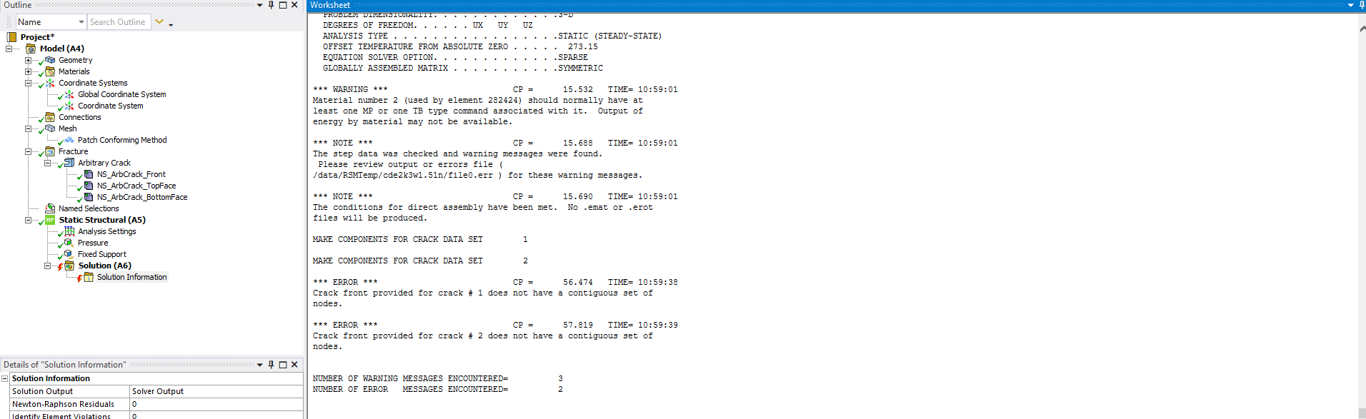 I have generated a crack in a cylindrical model using the Arbitrary crack method. During the simulation, an unknown error message is displayed. Solution information shows crack front does not have a contiguous set of nodes. The meshing and crack generation was although successful. I have no clue how to resolve this error.