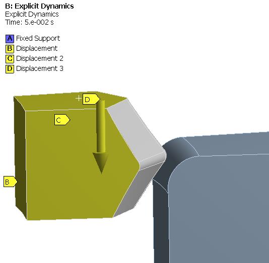 It will need to run for another 48 hours (or more) to make a groove 0.5 mm long. Since I didn't have your material file when I started this analysis, I used an Explicit material: POLYCARB that uses an Equation of State instead of Multilinear Plasticity. I artificially increased the material density by a factor of 100 in order to reduce the solution time, which was in the hundreds of hours without that density change. I could use a factor of 1000 on the material density to reduce solution time even further, but at some point, the artificially increased inertia forces will affect the results and they will no longer accurately represent the real problem.