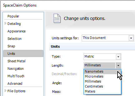 SubscriberIn Spaceclaim, you must change the Units before you start to create any geometry to shift the geometry engine to the smaller domain. This dialog box is found under the File menu.