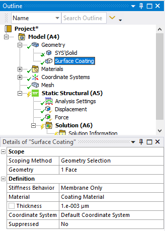 SubscriberThe surface coating in Mechanical is simply some automation to reduce the labor in creating shell elements on the surface of solid elements. You can mesh a surface and mesh a solid and use Mesh controls to get the identical nodes on the surface and the face of the solid, then do a Mesh Merge to have the shell and solid elements share the same set of nodes. Shared topology may also work.