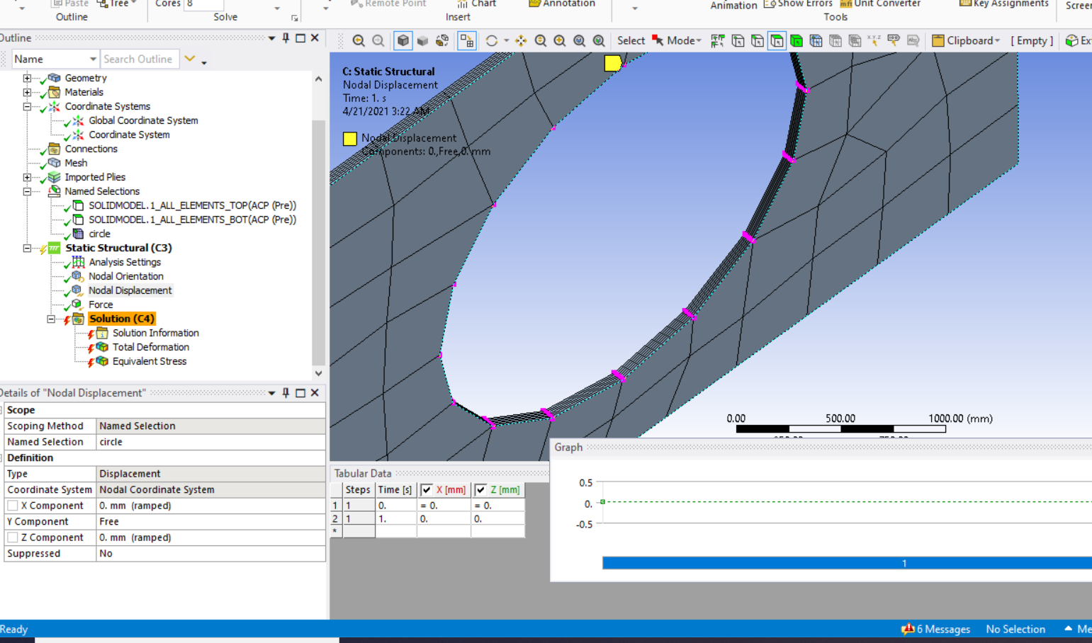 nIs this the correct setup for this type of part? I made a 5 ply composite plate with a hole that would have a bolt going through so it behaves like a tab. A force would be applied on the top face. For the solid geometry exported from ACP, I selected the node at each ply, so there were a few going across and then around the circle. I didn't try the shell geometry yet. For the nodal displacement, I fixed it in the x and z direction of the cylindrical support to imitate tangential and axial constraints. However, it was not able to solve. nnn