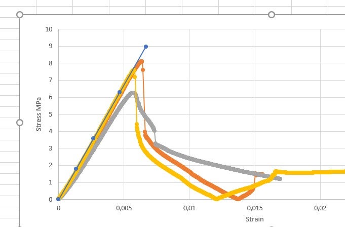 Subscriberhello everyone, it's the umpteenth post I'm making on this topic because I can't find a solution, I should simulate this compression test performed in the laboratory (on three specimens, yellow, gray and orange curve, the blue curve is to reproduce numerically). To be able to make the curve descend, I thought of using a script with the EKILL command which brings the stiffness to 0 but then using the ESTIF command I bring it back to 90% (I'm trying). The script works well but as the central rods are eliminated the program is no longer able to converge. Could you show me a new way in as much detail as possible, or how to improve mine. I am working on my thesis work. The script mine will