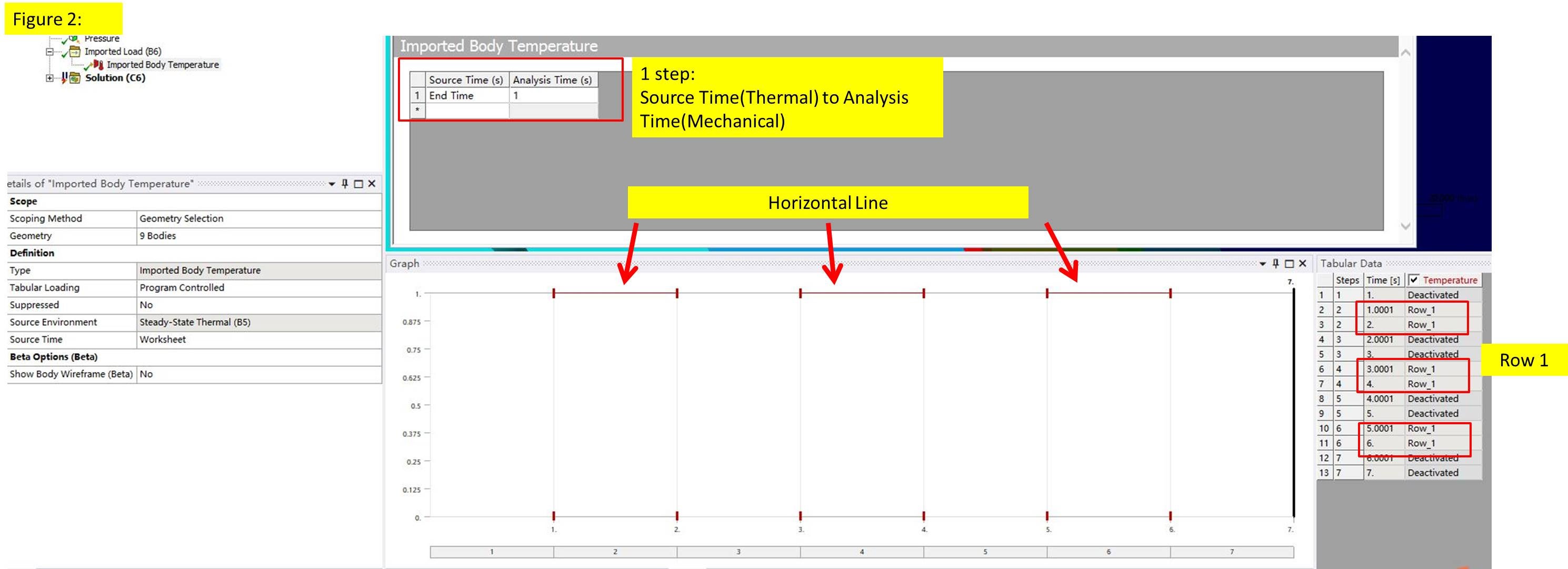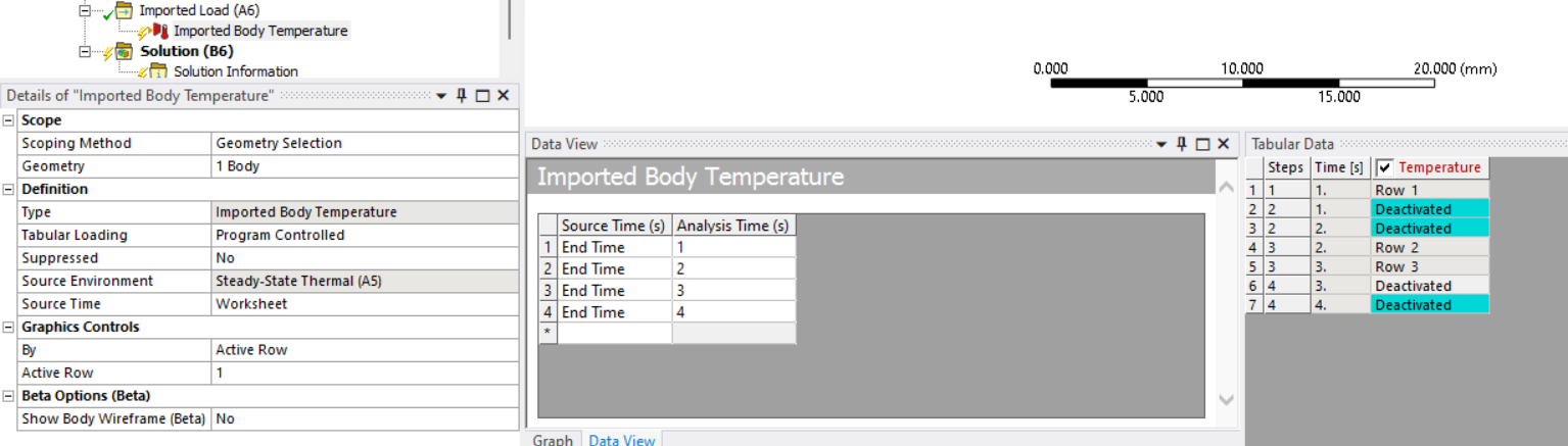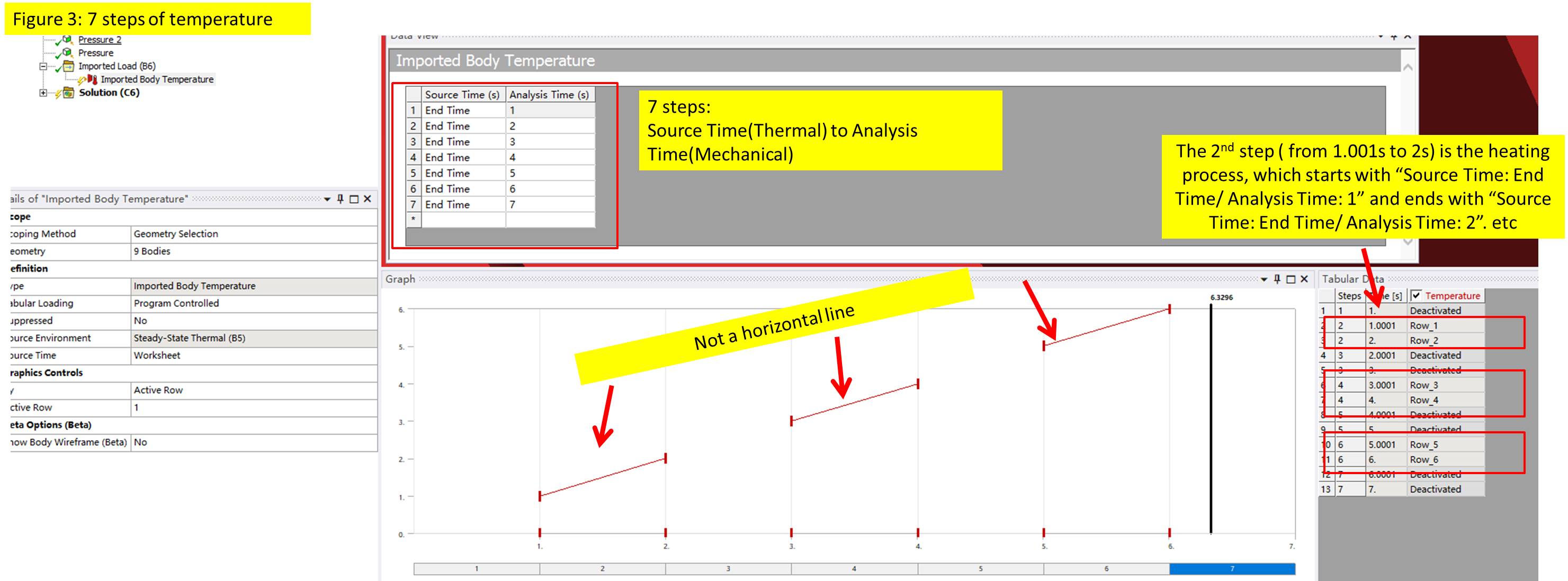 In fact, my Static Analysis has 7 steps. The 1st step is bolt-pretension. The 2nd, 4th and 6th steps are pressure loading and heating while the 3rd, 5th and 7th steps are unloading and cooling. See Figure 1 for pressure loading and unloading. The way of how I imported the temperature is shown in Figure 2 while your way is shown in Figure 3. The Data View, Graph, and Tabular Data show the big difference. The "Auto Time Stepping" is ON. The Initial Substeps, Minimum Substeps and Maximum Substeps are 10, 5, and 100, respectively. So the Time(s) in Tabular Data is shown as 1.0001, etc.