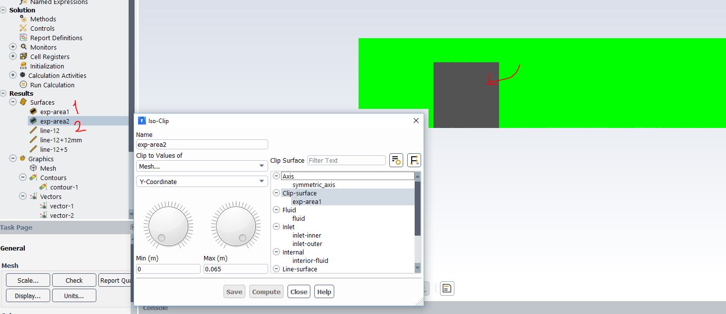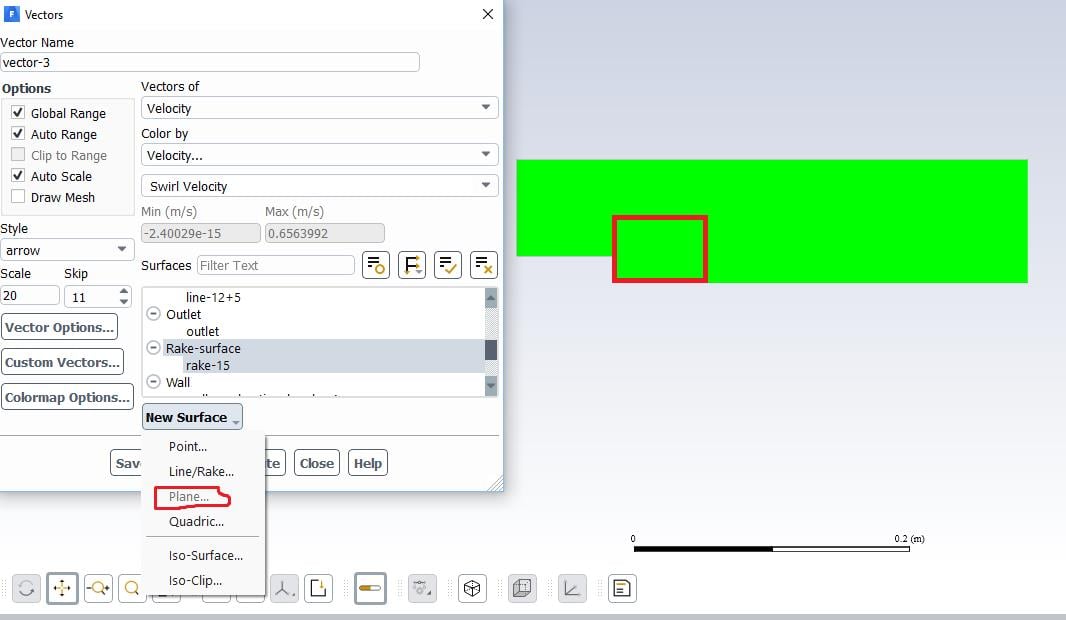 I have a 2D model in Fluent, and I have calculated the model. In processing the data, I am interested in plotting the calculated results on a smaller window/plane rather than on the whole geometry. But I can not define a "plane" using defining "new surface". Please see the figure below: The green area is the 2D (axi-symmetric) geometry. The "plane" option is inactive. and I want to plot the results for a rectangle area similar to the red rectangle I draw on the geometry.