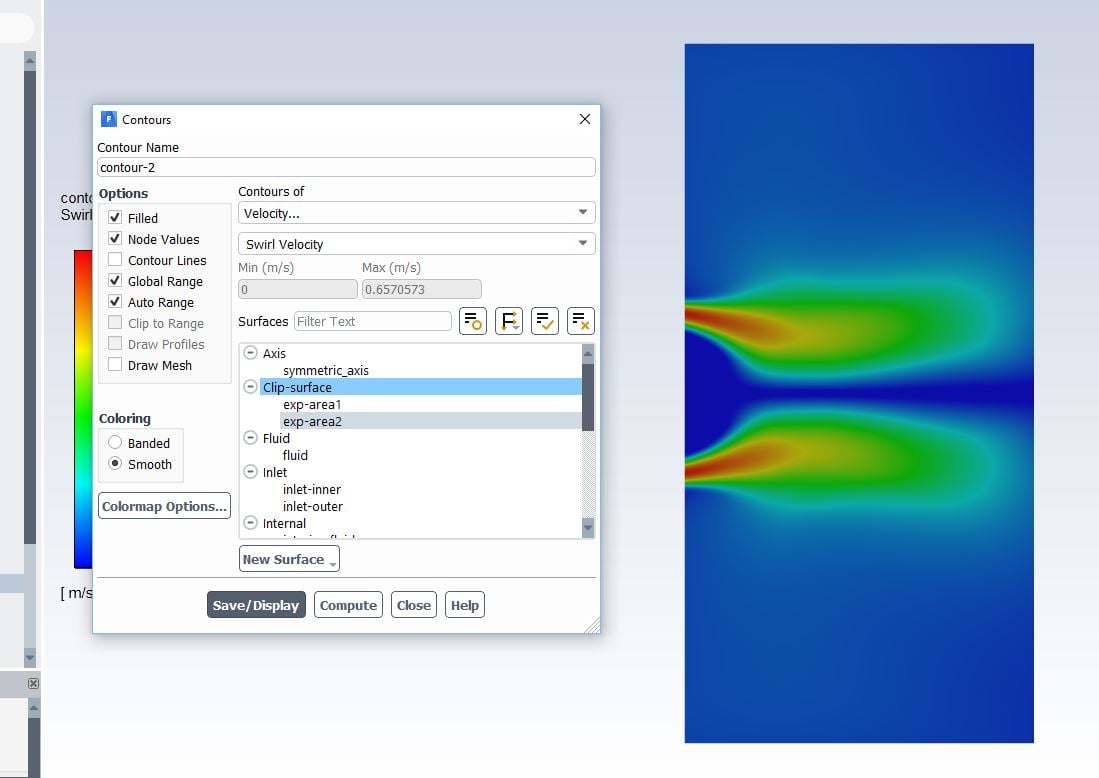 Now I can plot the results only on that area. But I cannot write it to a file. Do you know how can I do it? For instance, as the figure below shows, I have the plotted swirl velocity distribution on that area. I also have the data from experiments for same area. I need to export the model results (x, y, velocity) from the model (as from the figure below) to a file and compare it with experiments.