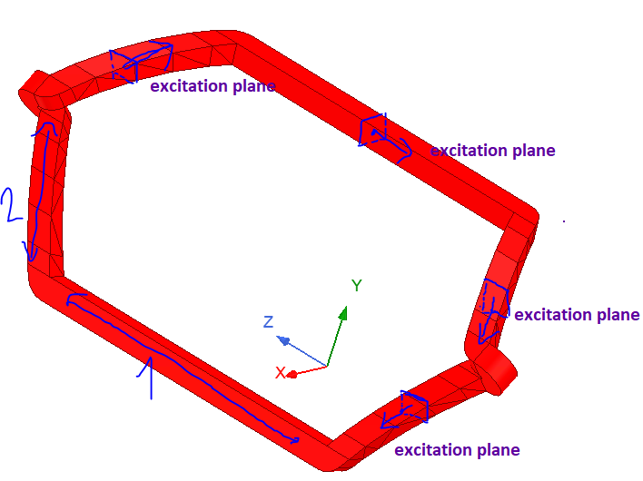 I have the following 3D solid block coil geometry in Fluent 2021 R2. It has a higher thermal conductivity in the direction normal to the excitation plane compared to in-plane thermal conductivities. For example, for portion 1, the thermal conductivity is higher in the z-direction. For portion 2, thermal conductivity is higher in the z-y direction. Since the excitation plane changes direction at different parts of the coil, the coil has a varying thermal conductivity in XYZ directions along its path.